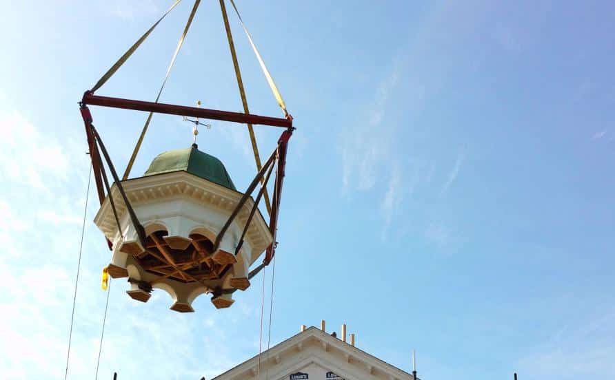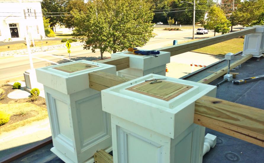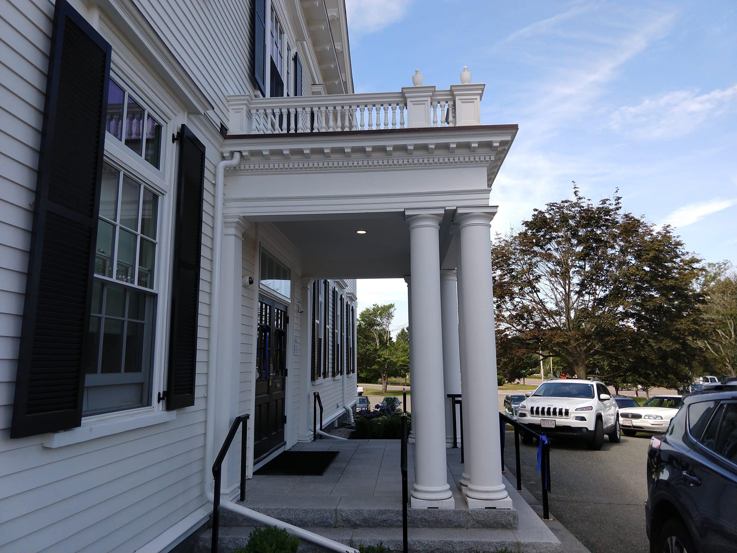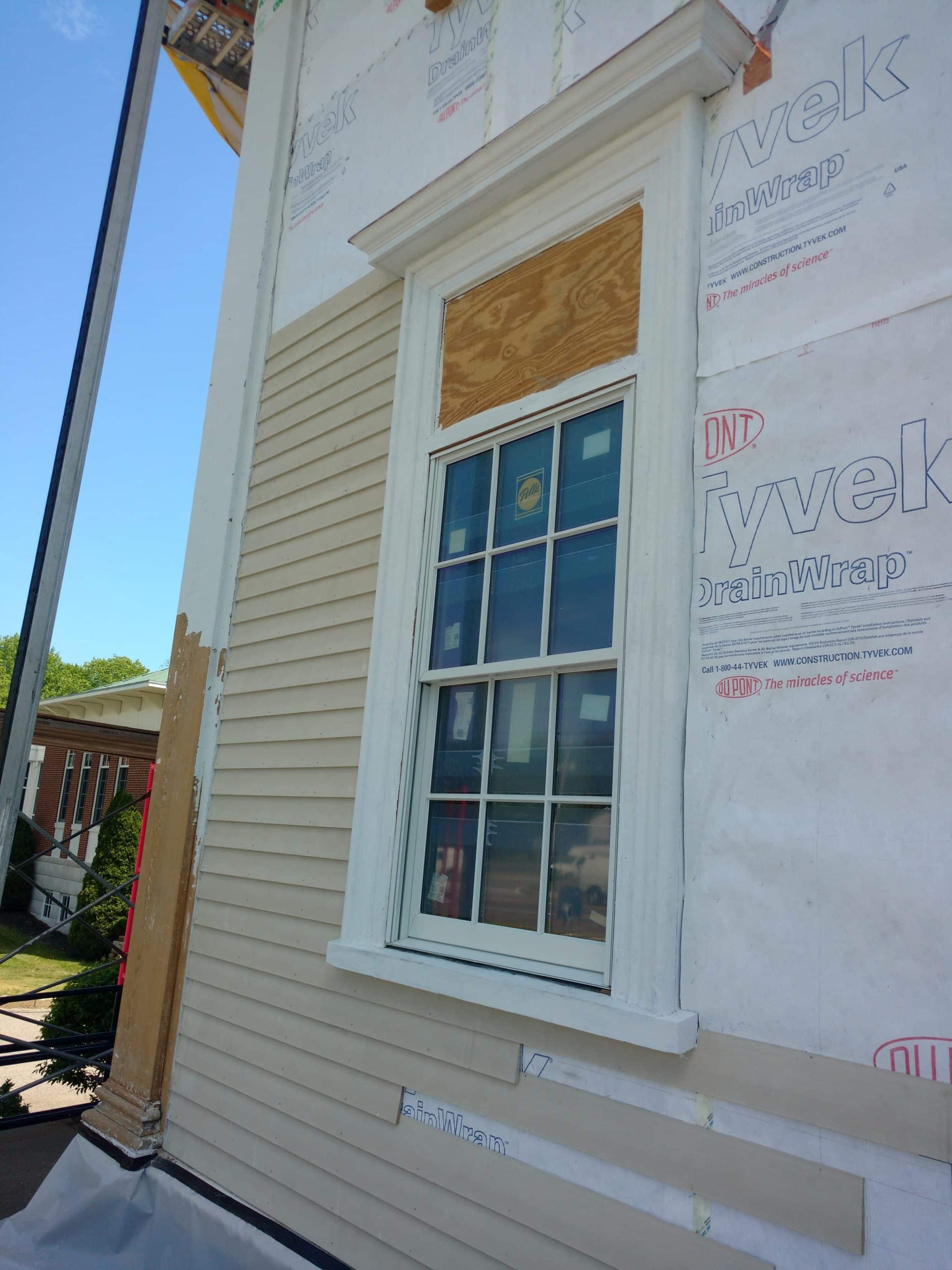 The restoration of the Town Hall was divided into multiple phases. The first phase completed in 2017 included the cupola restoration, new poly-ash siding, wood trim restoration, portico repairs, pilaster capitol replacement, and window replacement.