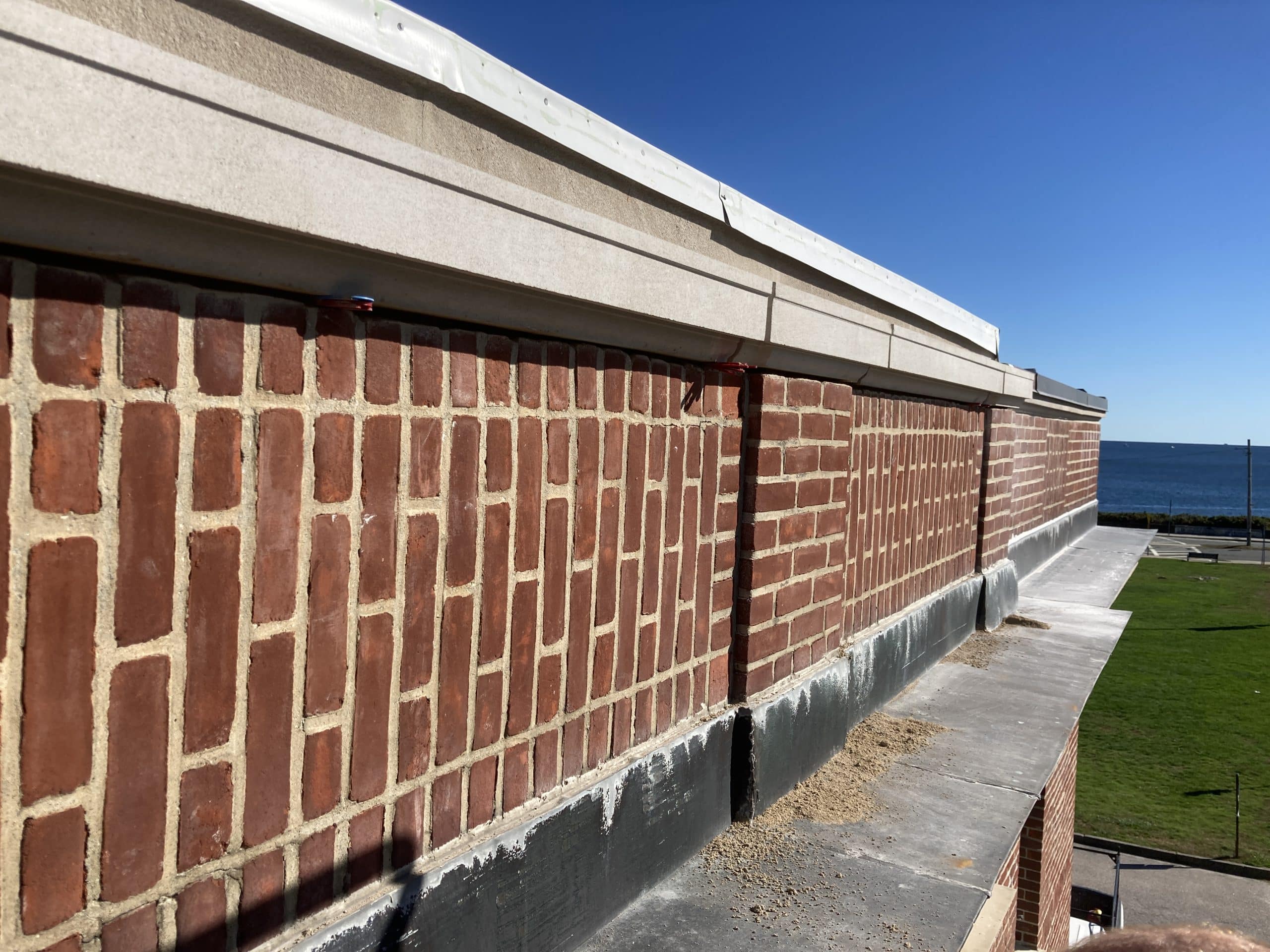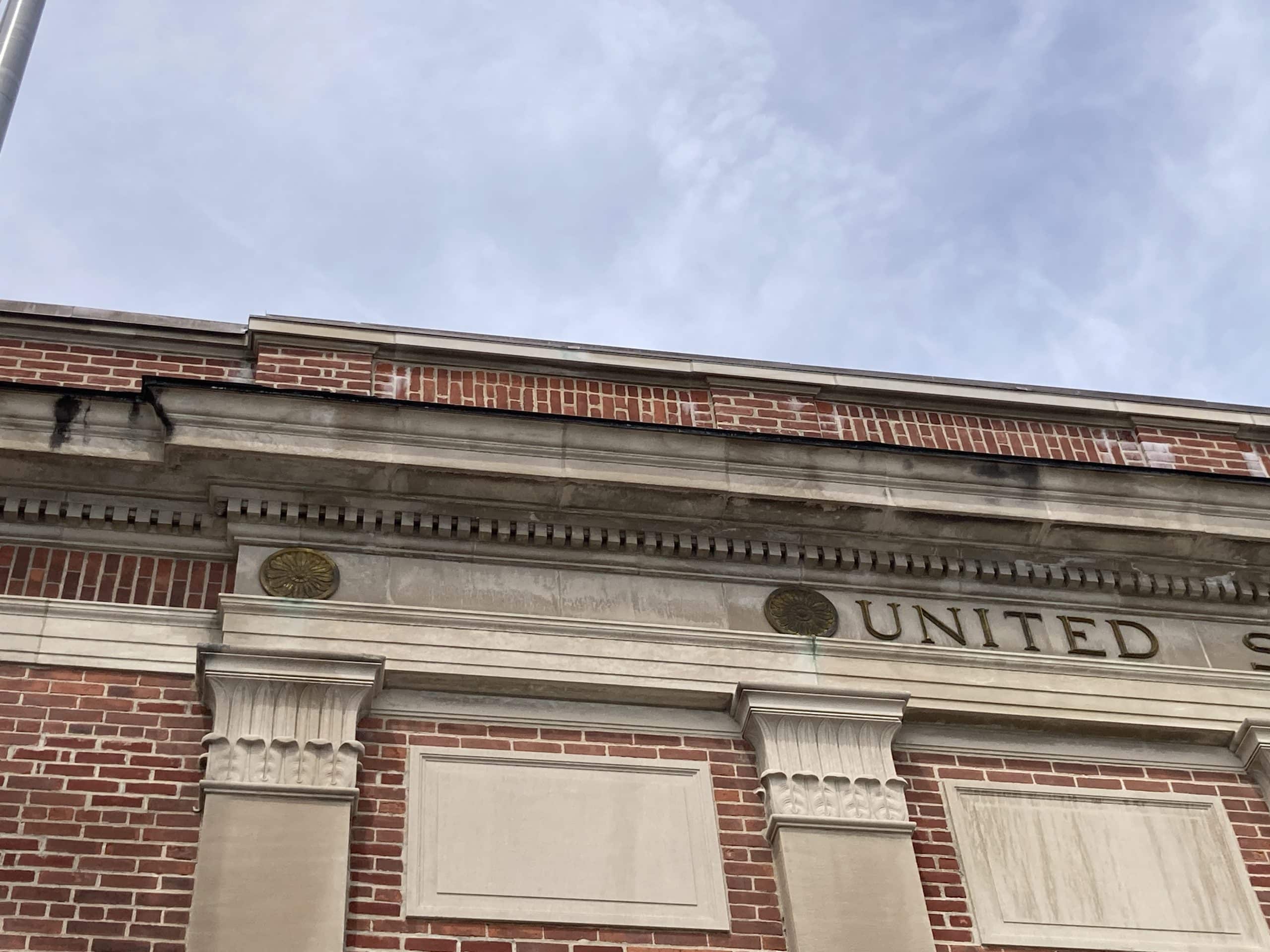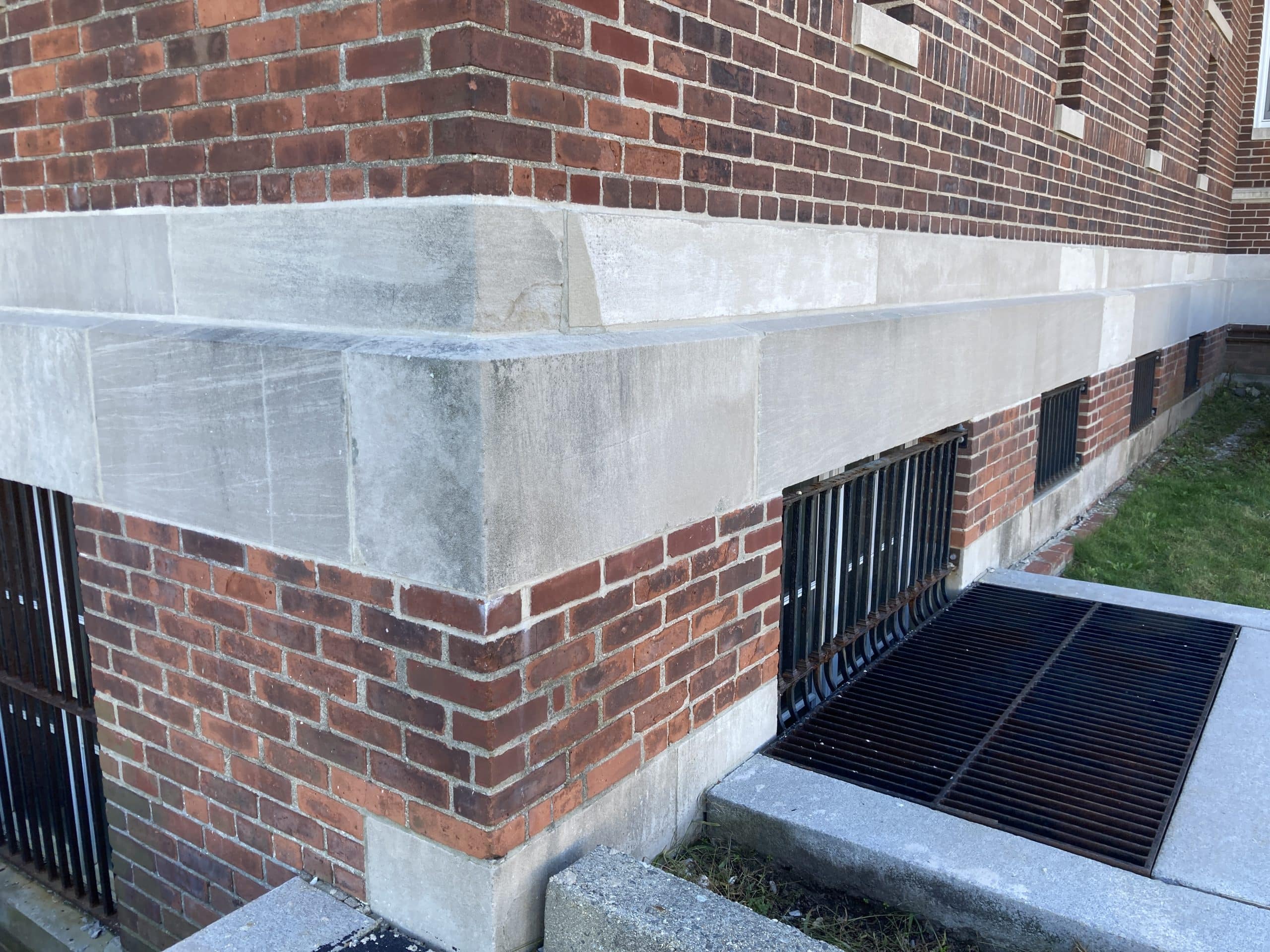 The exterior envelope renovation project at the Narragansett Post Office underwent a masonry project, including repointing and masonry repair.